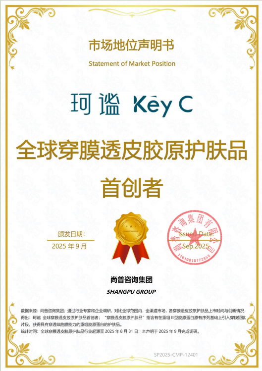 尚普咨询此次授予珂谧的“全球穿膜透皮胶原护肤品首创者”认证,正是为破解这一痛点而生,它实际上为消费者构建了一个简单明了的判断标准——在这个标准下,"胶原能否真渗透"不再是一个营销话术,而是一个可验证的科学事实。