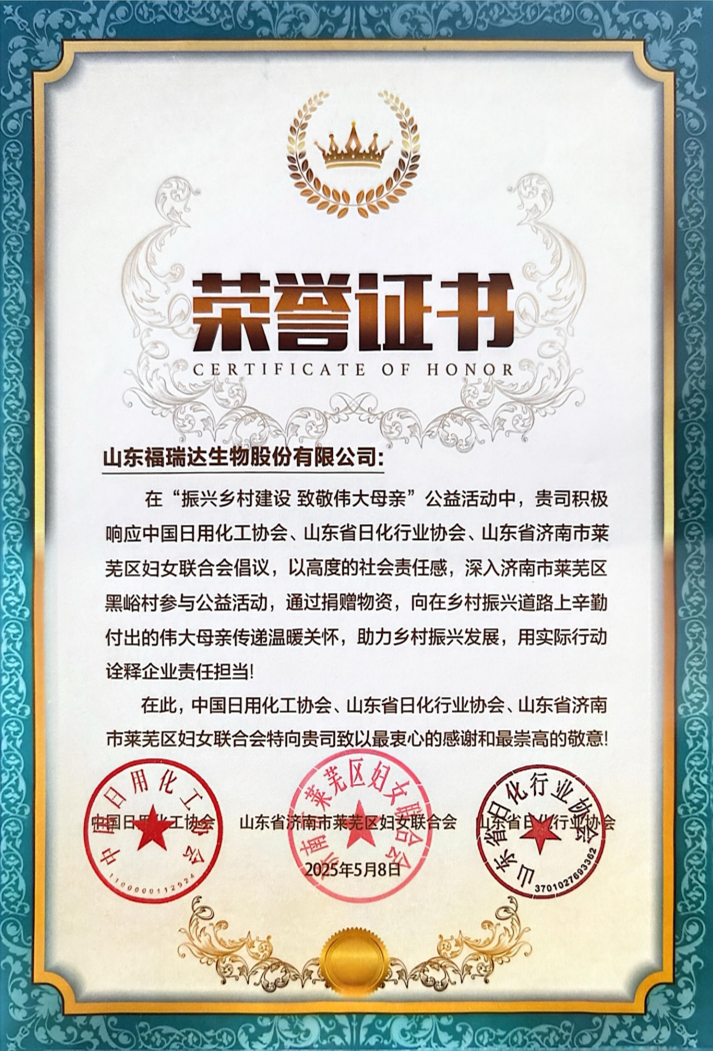 为积极响应国家乡村振兴战略,弘扬中华民族孝敬母亲的传统美德。2025年5月8日,由中国日用化工协会、山东省日化行业协会、济南市莱芜区妇女联合会共同发起的“振兴乡村建设,致敬伟大母亲”公益活动在济南市莱芜区黑峪村举行。福瑞达生物股份积极响应公益活动号召,在母亲节前夕以爱之名致敬乡村母亲。