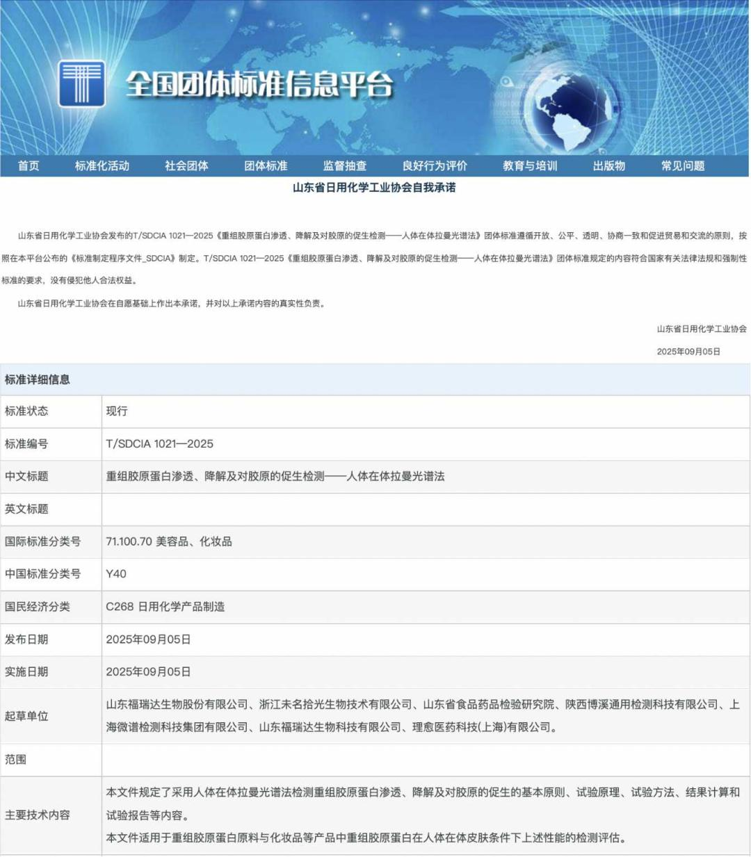 近日,由山东省日化行业协会归口组织、江南平台有限公司牵头起草的《重组胶原蛋白渗透、降解及对胶原的促生检测——人体在体拉曼光谱法》团体标准正式发布实施,标志着重组胶原蛋白皮肤渗透检测有了新标准。